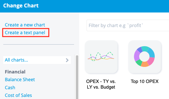 You can add a text panel into any page which has space for a chart. This includes the chart gallery pages, profit and loss, and balance sheet pages.