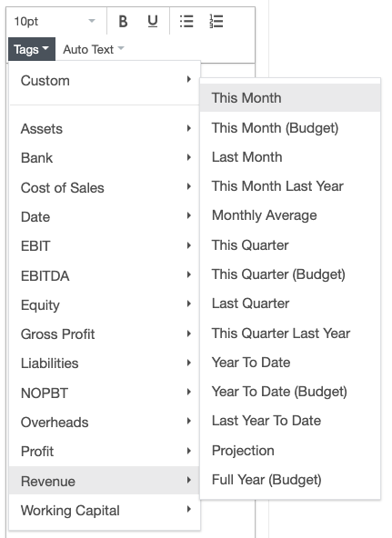 Tags represent individual pieces of data from within Spotlight. For example, you may want to insert a tag to include the date of the report, or the current months revenue. There are many pre-set tags available, and you can also create your own custom tags if needed.