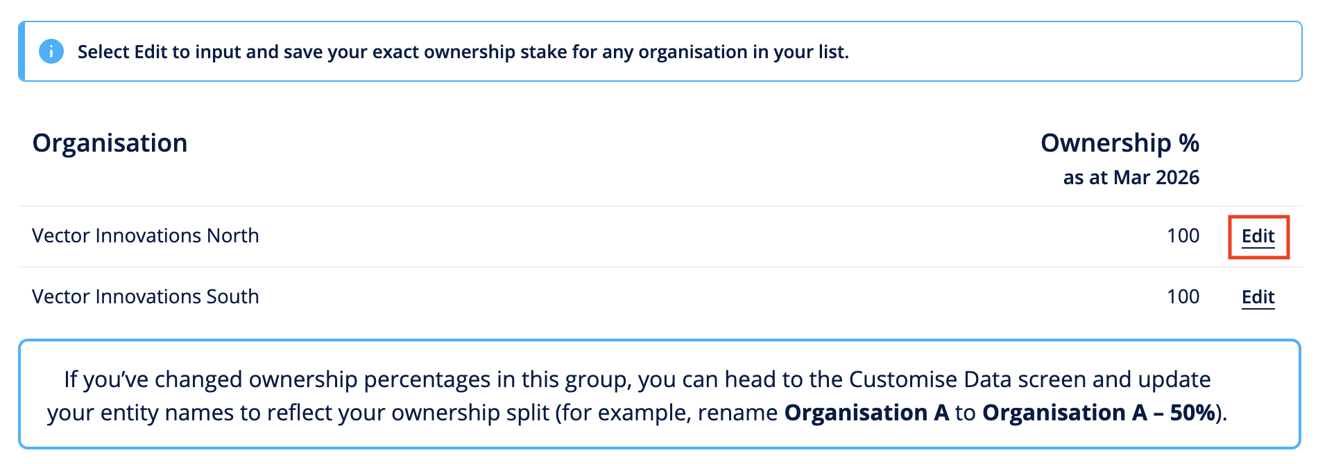 Alternatively, within the Customise Data tab for the group click Edit Fractional Ownership.