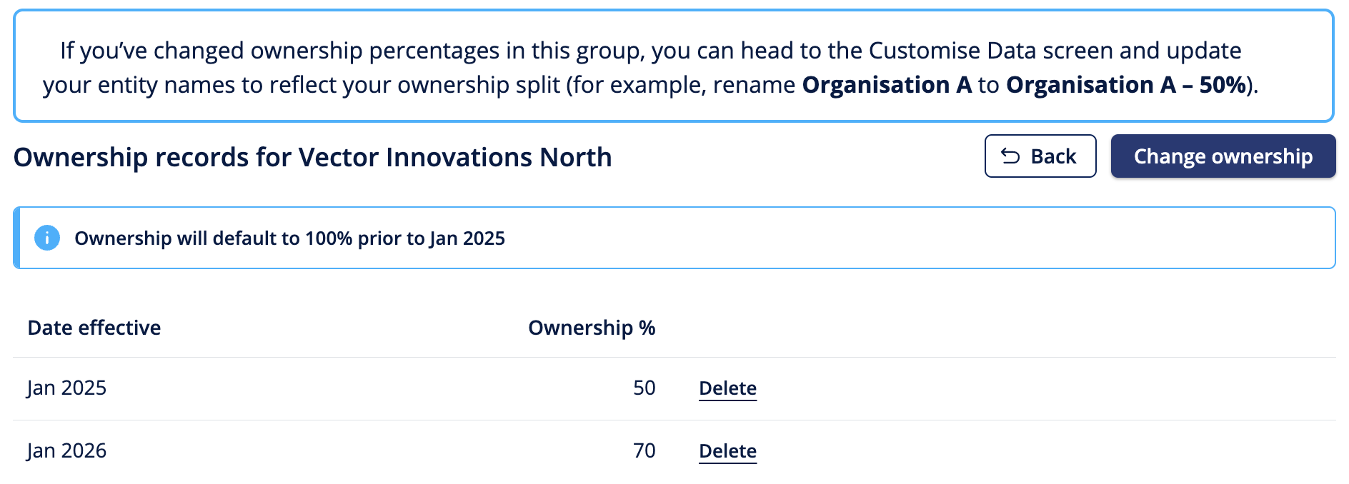 If required, you can repeat the process to include a different percentage as of a different date. For example, if the entity was 50% owned from January 2025 but became 75% owned as of January 2026, you can enter both dates. The ownership records will then show both dates and the percentage involved, and the reports will include the values as needed.